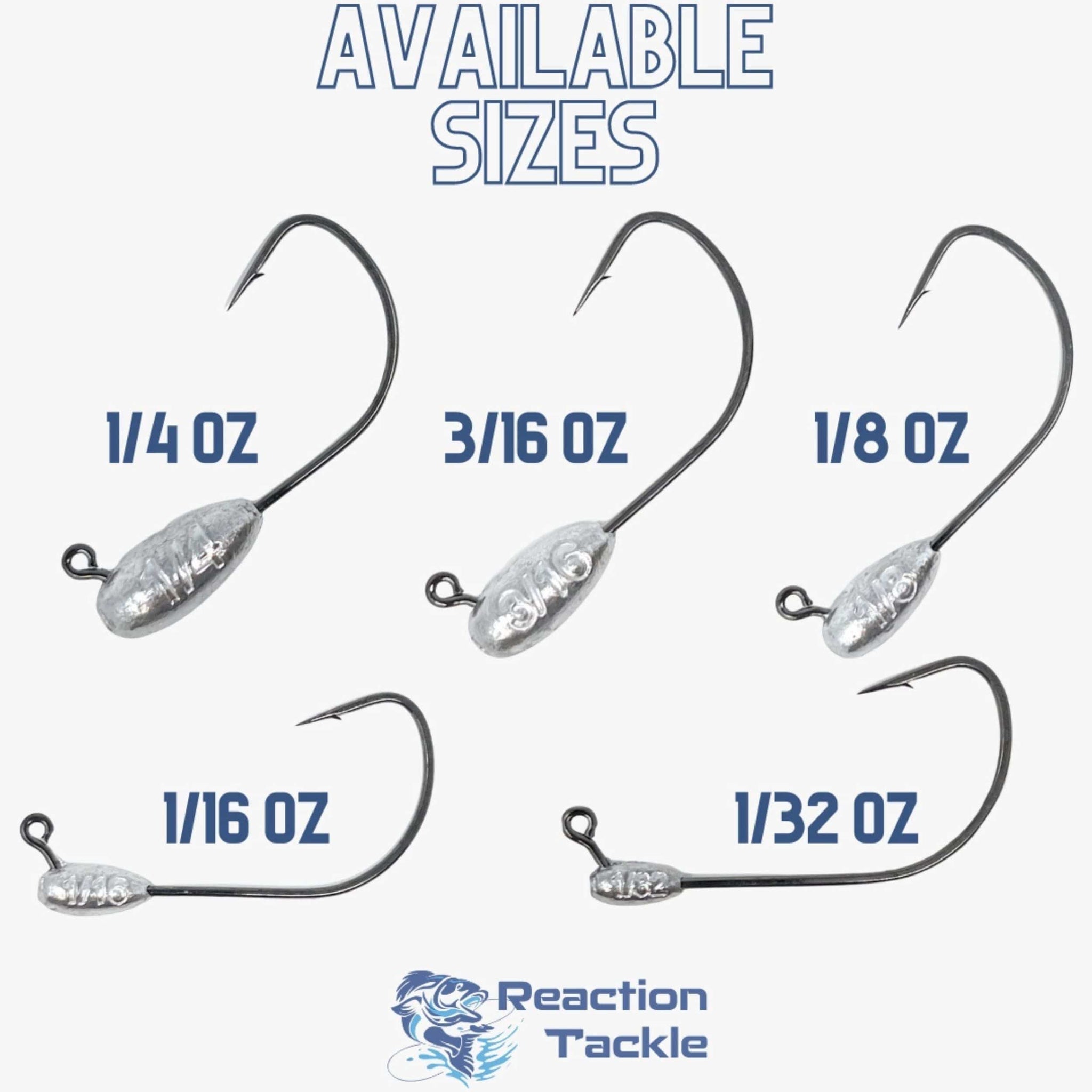 | Sizes (all with 4/0 hook) | 1/32 oz, 1/16 oz, 1/8 oz, 3/16 oz, 1/4 oz |