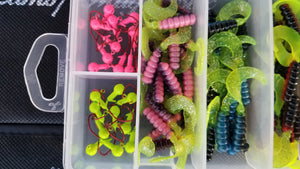 Spool the reel with light mono or fluorocarbon, tie on one of the included jigheads, and thread a curly tail grub so it hangs straight. Adjust weight to match depth and wind.