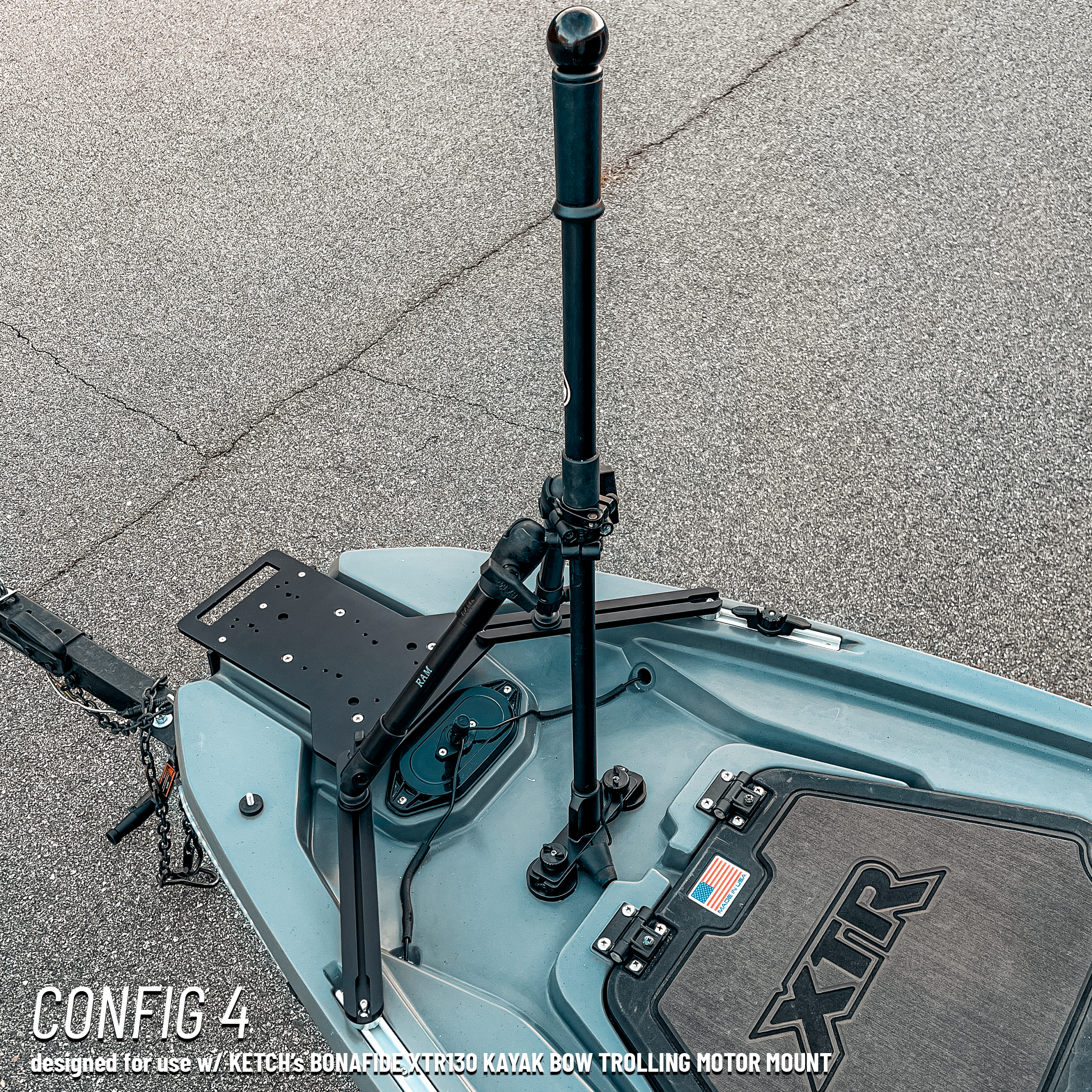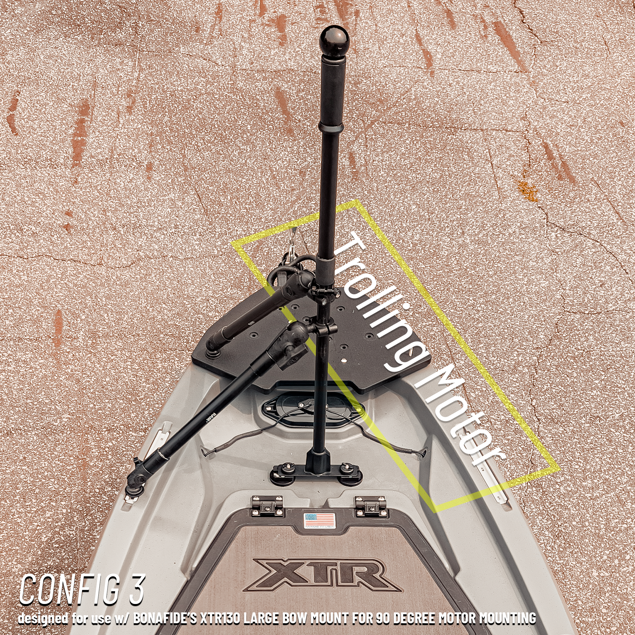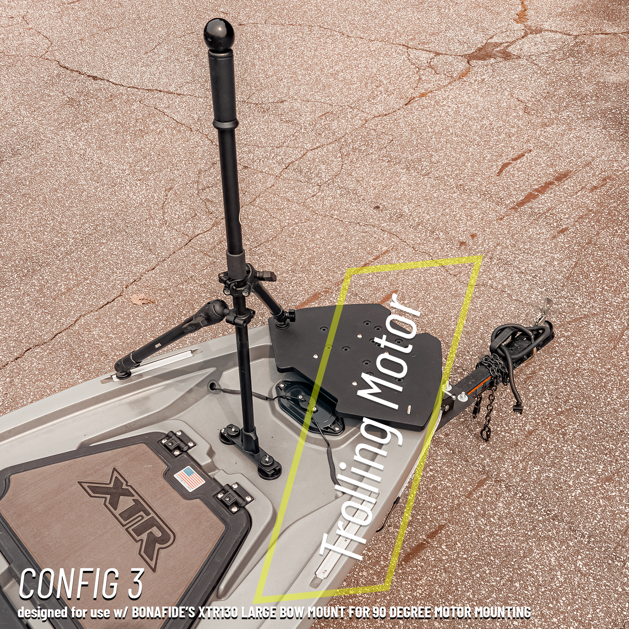 | Available Configurations | 1) Stock bow install. 2) With Bonafide Large Bow Mount for 90° motor mounting (not included). 3) With Bonafide Large Bow Mount, optimized for offset bow trolling motor (not included). 4) With Ketch Bonafide XTR 130 Bow Trolling Motor Mount (not included). |