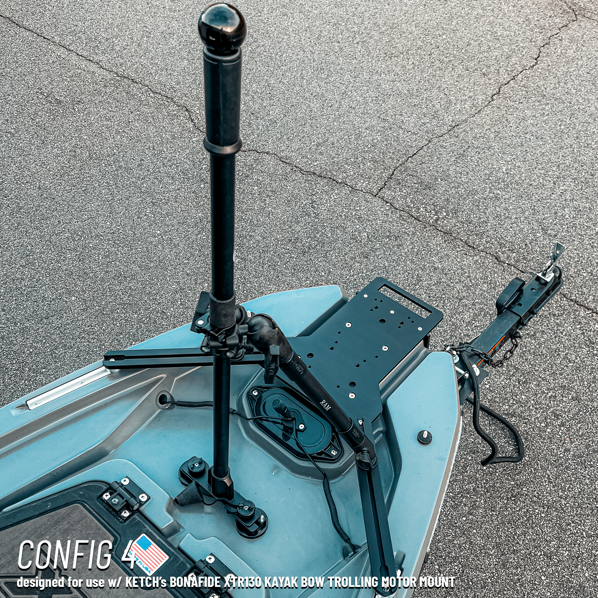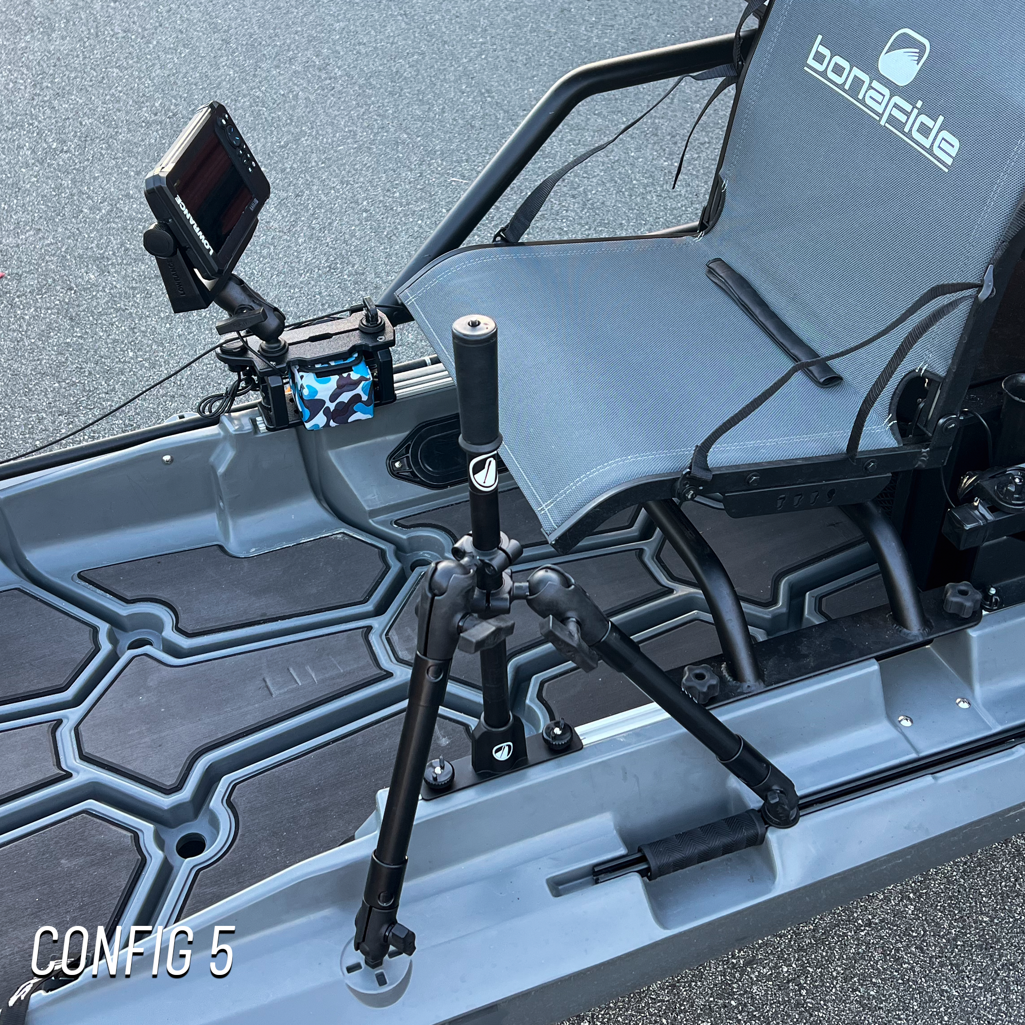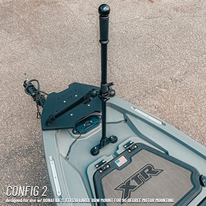 Choose Config 1 for a stock bow. Pick Config 2 or 3 when using the Bonafide Large Bow Mount (90° or offset motor). Select Config 4 when using the Ketch Bow Trolling Motor Mount.